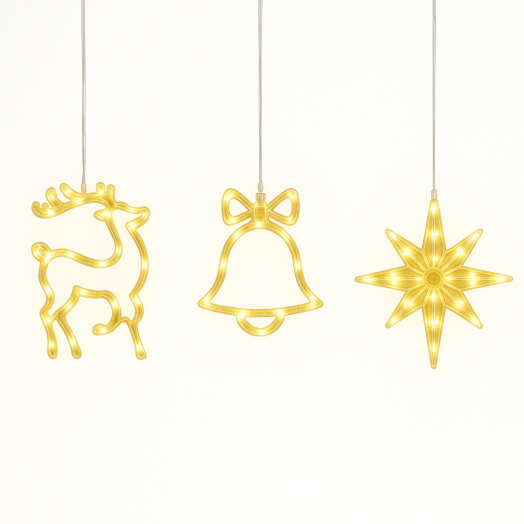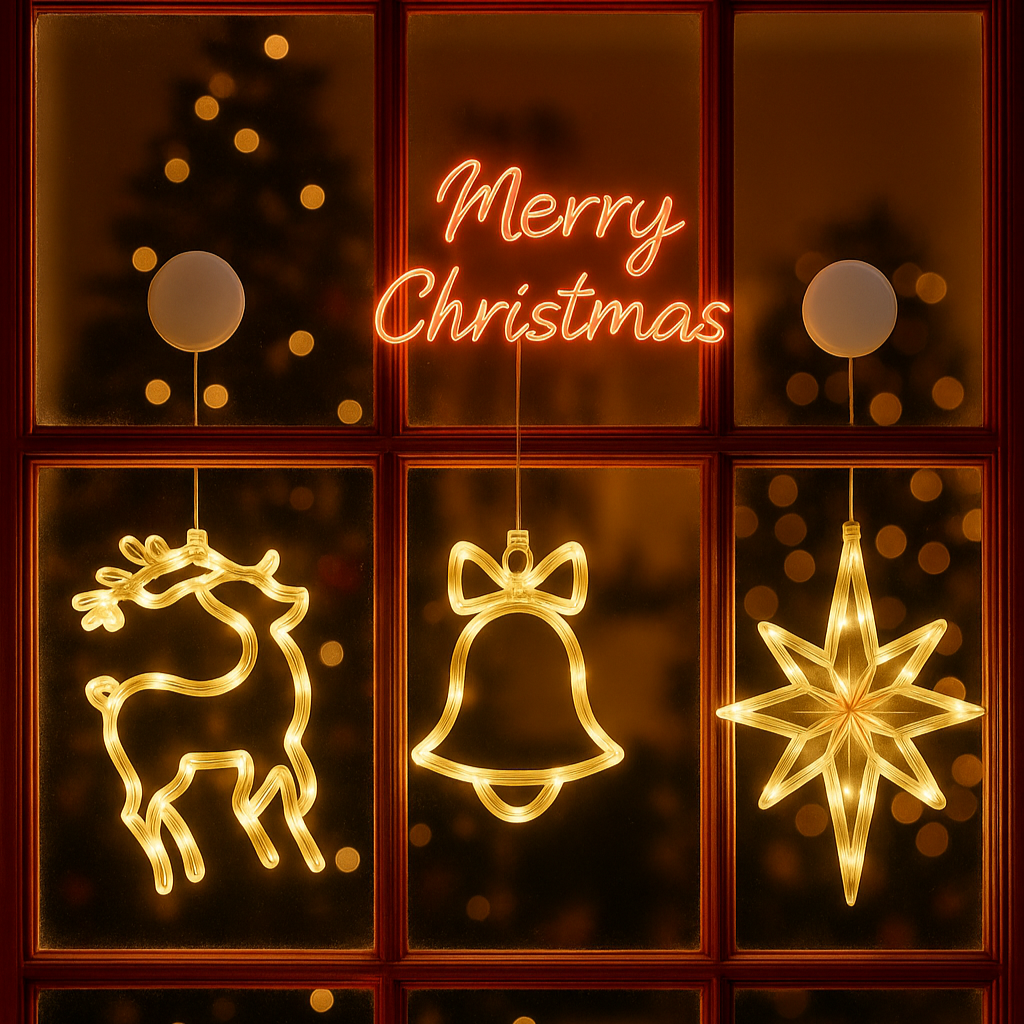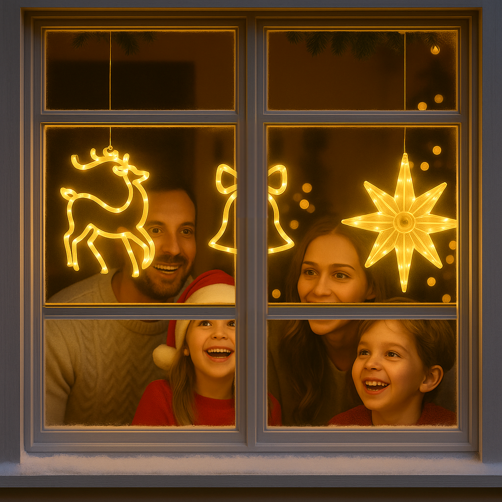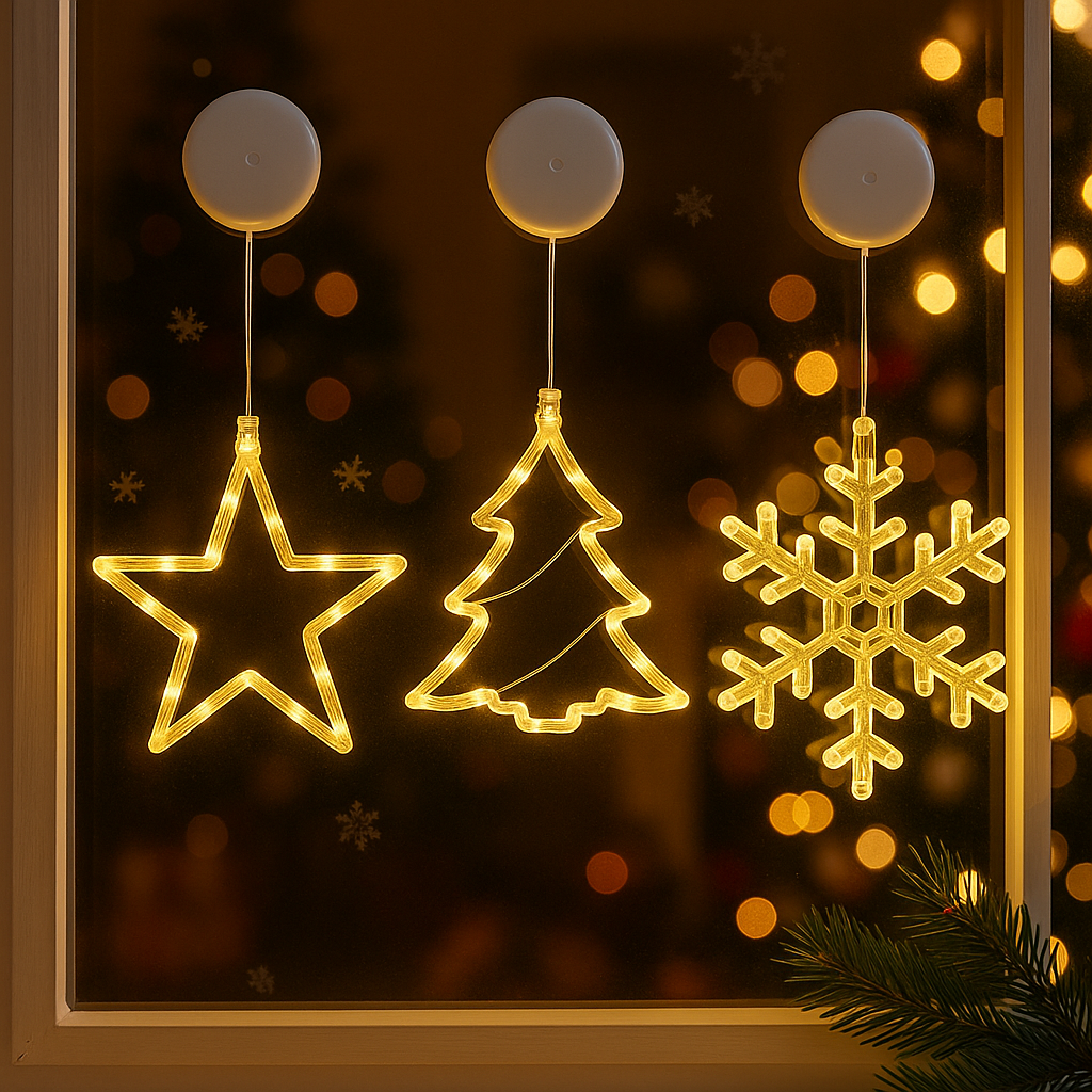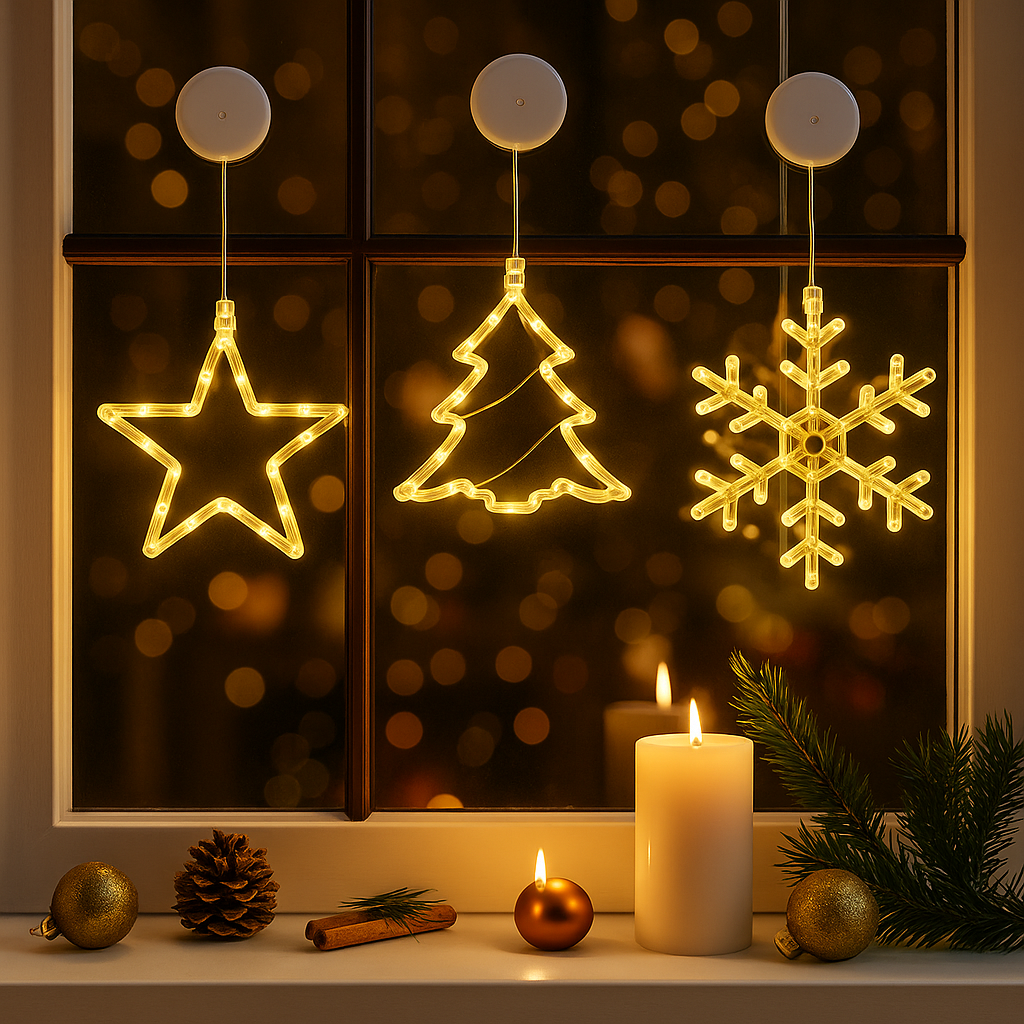 Stimmungsvolle LED-Fensterlichter für festliche Weihnachtsatmosphäre – batteriebetrieben, vielseitig & wiederverwendbar.