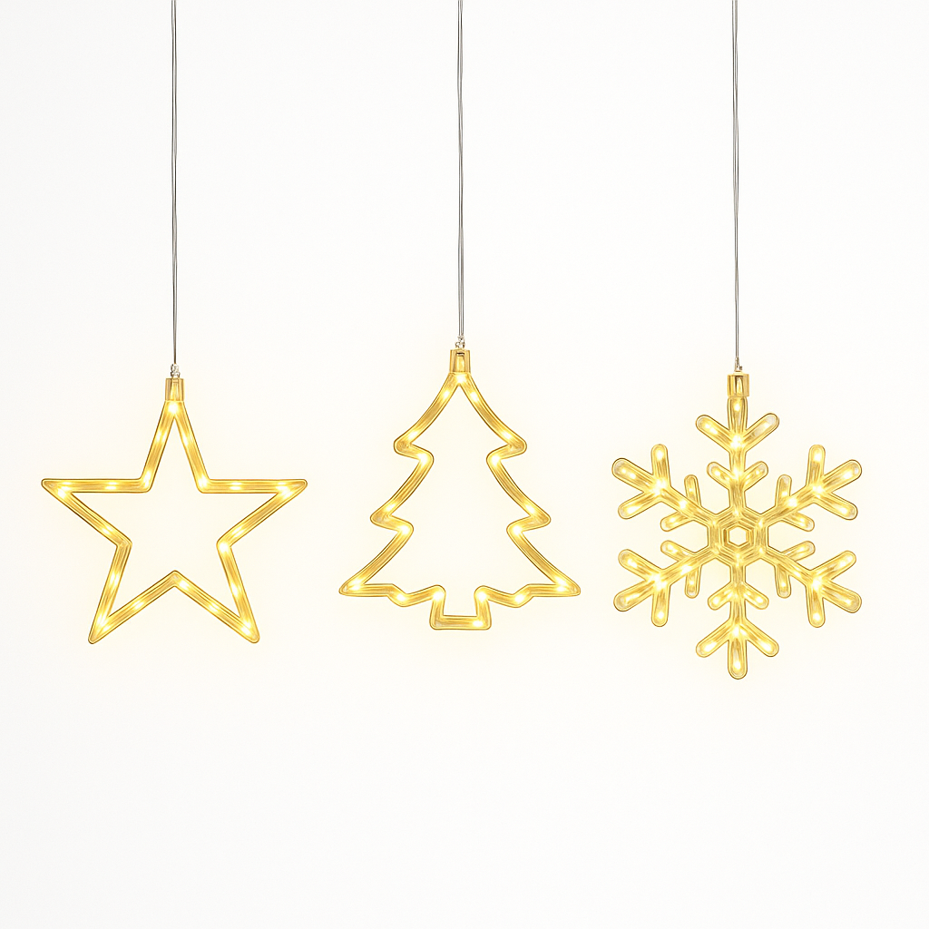 Die warm leuchtenden LED-Motive in Stern-, Schneeflocken- und Tannenbaumform sorgen für eine behagliche Stimmung – perfekt für Fenster, Wände oder Türen.