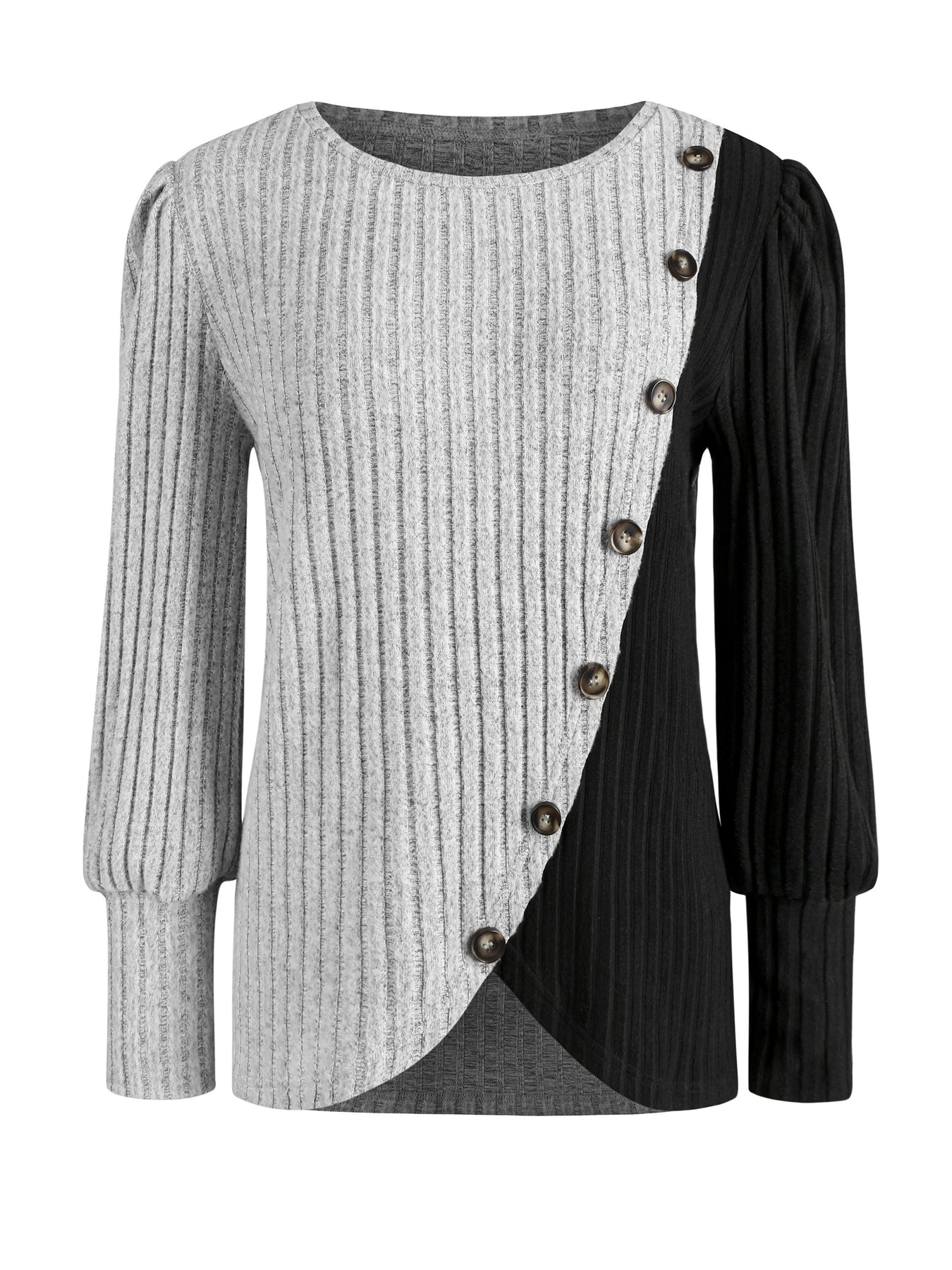 Weiches, geripptes Langarmshirt mit dekorativen Knöpfen, elegantem Rundhalsausschnitt und angenehmer Stretch-Passform – perfekt für Alltag, Büro und Freizeit.