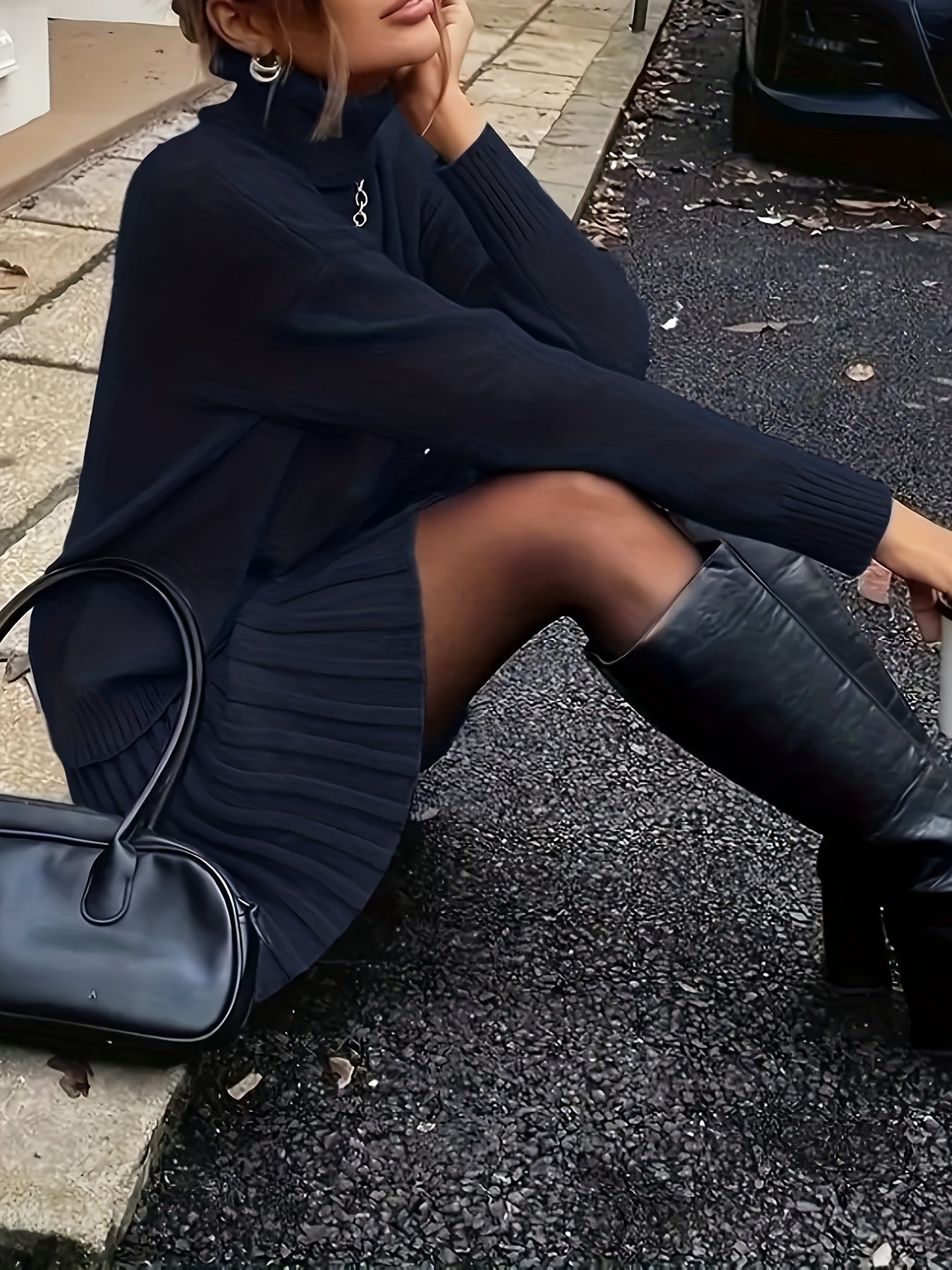 Das Set besteht aus einem hochgeschlossenen, langärmligen Pullover und einem passenden Rock mit Rüschensaum, gefertigt aus weichem, dehnbarem Strickstoff.