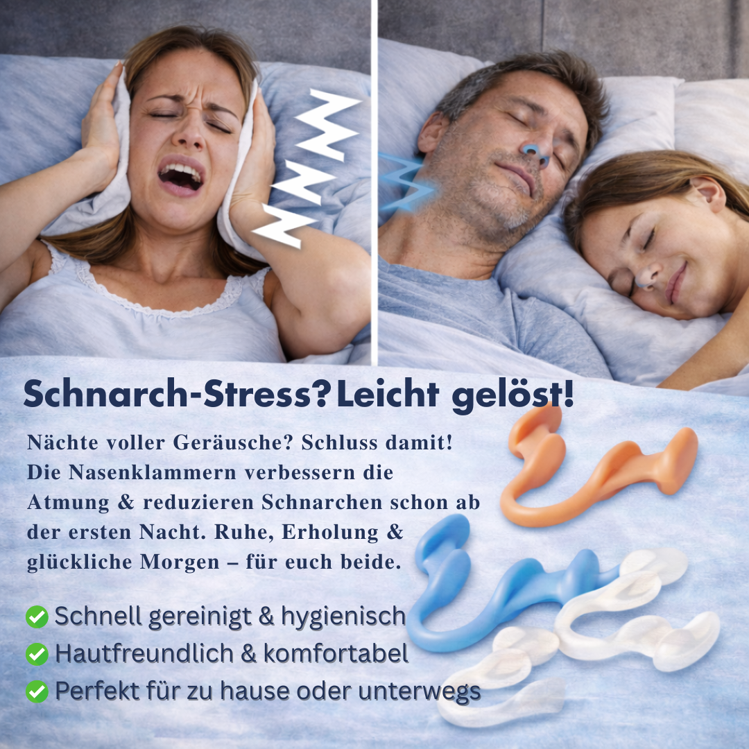 SilentNose wurde entwickelt, um die Nasenatmung zu verbessern und Schnarchen auf natürliche Weise zu reduzieren. Die weichen, ergonomisch geformten Silikonklammern öffnen sanft die Nasenwege, fördern einen gleichmäßigen Luftstrom und können so nächtliche Geräusche deutlich minimieren. Ideal für alle, die ruhiger schlafen möchten – ob Zuhause, im Hotel oder auf Reisen.